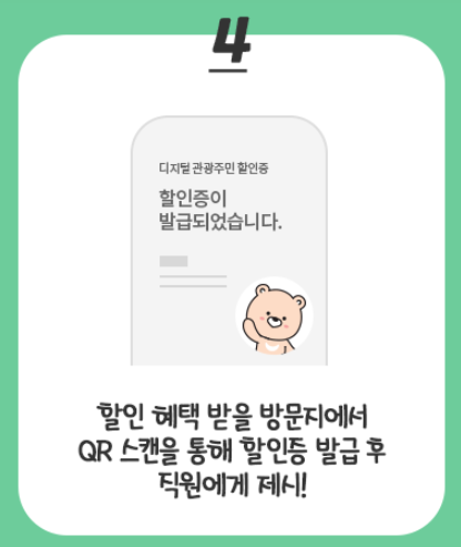 디지털 관광주민증을 사용하기 위해서는, 발급받은 카드를 마이페이지에서 확인한 후, 방문하는 장소에서 제시하면 됩니다. 음식이나 관광지에서 이 카드를 보여주면 할인 혜택을 받을 수 있답니다.